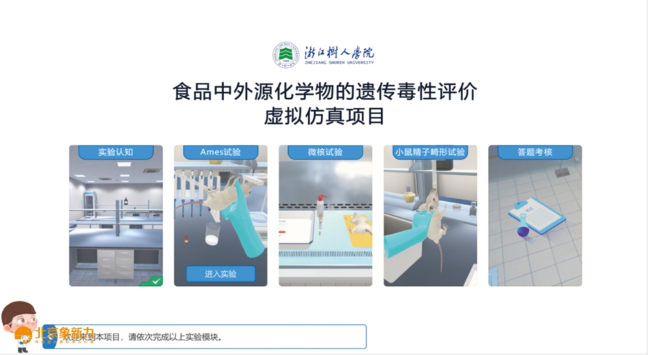 本软件三维模型以动物实验室为原型进行建模,三维场景包括动物房、更衣室、检疫室、灭菌室、实验室、洗消间等,软件内容以遗传毒性试验(包括Ames试验、小鼠骨髓嗜多染红细胞微核试验、小鼠精子畸形试验)的实验设计、操作流程及规范为主线,旨在让学生深化对于食品安全性毒理学评价的方法和仪器设备的工作原理的认知。