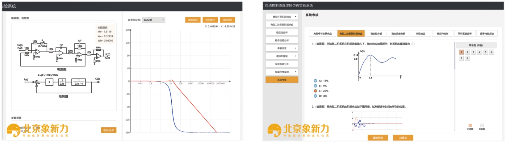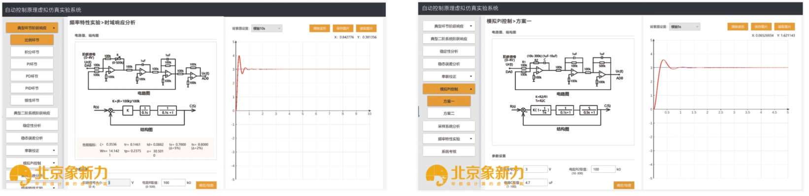 本产品通过放大器配合不同阻抗网络模拟常见的控制系统,如比例环节、积分环节、惯性环节、典型二阶系统阶跃响应、稳定性分析、串联校正、采样系统分析、频率特性实验等。学生可以设置不同的参数,通过观察阶跃响应曲线,了解控制系统的相关规律。