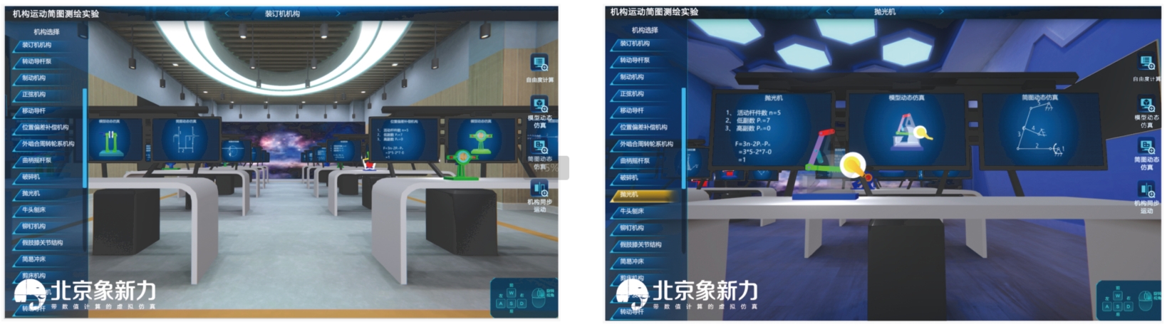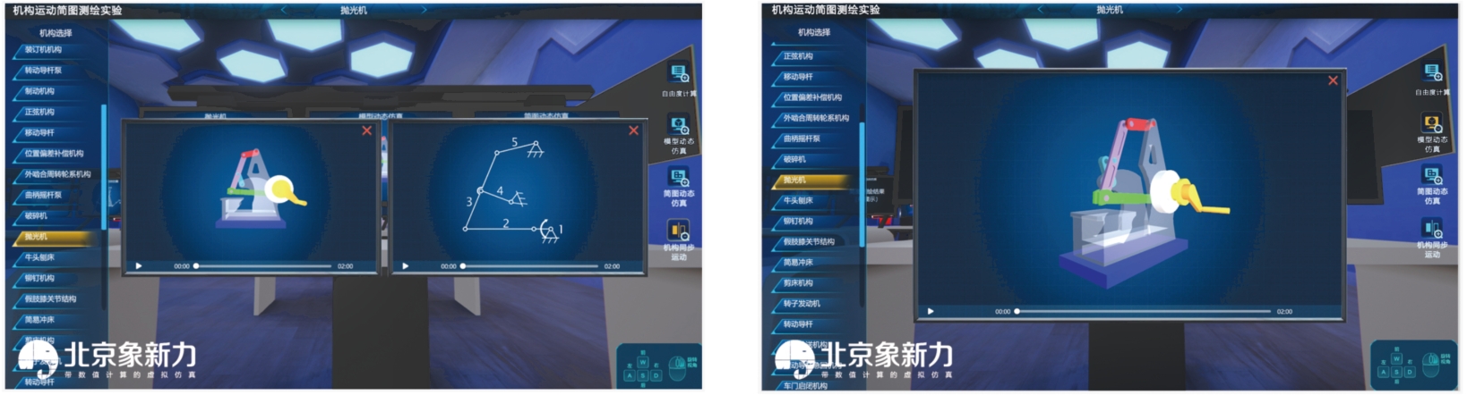 以三维模型为主,辅以自由度计算,同时展示机构运动简图的形式,呈现机构运动简图的相关知识;实验中三维模型支持自由旋转及缩放操作,另外三维模型和机构运动简图支持运动展示。通过多种机构运动分析,反复加强学生对机构简图的理解以及自由度的计算,大大加强了教学效果。